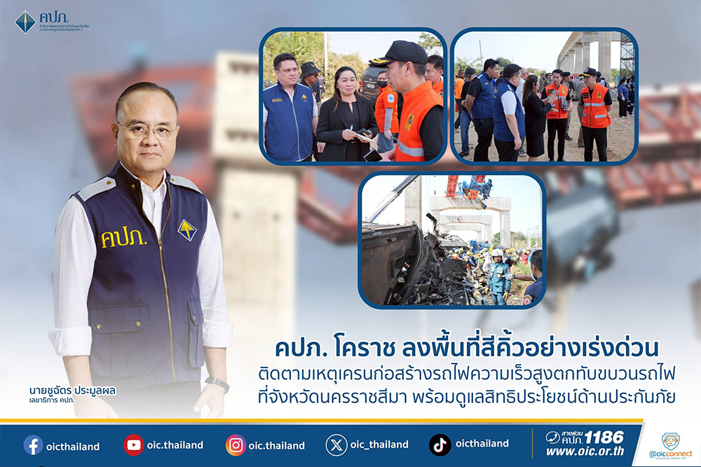 คปภ. โคราช ลงพื้นที่สีคิ้วอย่างเร่งด่วน ติดตามเหตุเครนก่อสร้างรถไฟความเร็วสูงตกทับขบวนรถไฟ ที่จังหวัดนครราชสีมา พร้อมดูแลสิทธิประโยชน์ด้านประกันภัย