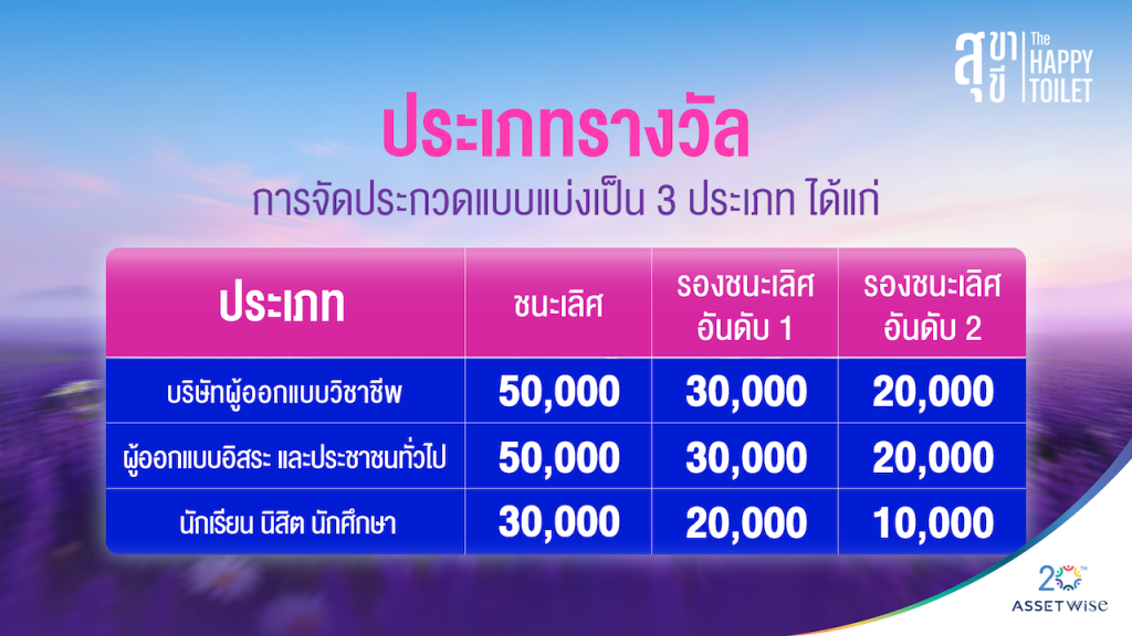 “แอสเซทไวส์” ยกระดับพื้นที่แห่งความสุขเพื่อเมืองน่าอยู่ จัดโครงการประกวด “สุขา สุขี: THE HAPPY TOILET PROJECT” เชิญชวนนักออกแบบ ประชาชนทั่วไป และนักเรียนนักศึกษา สร้างสรรค์ผลงานออกแบบ “ห้องน้ำที่สร้างความสุขให้ทุกคน” ร่วมพลิกโฉมห้องน้ำสาธารณะของไทยให้สวยงามสะอาด ปลอดภัย ใช้ง่ายสำหรับทุกคนอย่างเท่าเทียมและยั่งยืน พร้อมชิงเงินรางวัลรวม 260,000 บาท