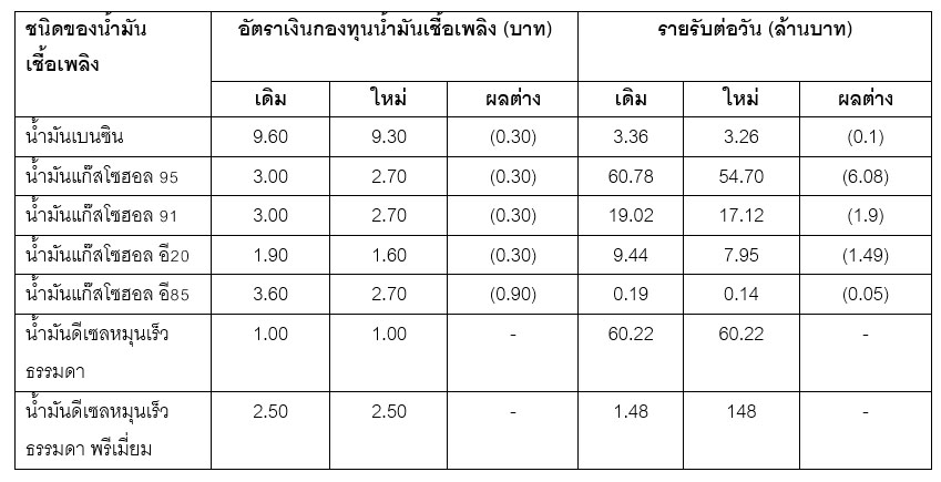 โดยลดราคาขายปลีกน้ำมันดีเซลลง 50 สตางค์/ลิตร จาก 31.44 บาท/ลิตร เป็น 30.94 บาท/ลิตร นอกจากนี้ยังมีการปรับลดราคาขายปลีกน้ำมันเบนซินลงทุกชนิด 30 สตางค์/ลิตร เพื่อให้ประชาชนได้รับประโยชน์โดยตรงจากการบริหารจัดการราคาพลังงานอย่างทันท่วงที ภายใต้หลักการทำงาน “เปิดเผย-โปร่งใส-ตรวจสอบได้” ของ กบน. และสำนักงานกองทุนน้ำมันเชื้อเพลิง (สกนช.) โดยมีรายละเอียดในตาราง ดังนี้