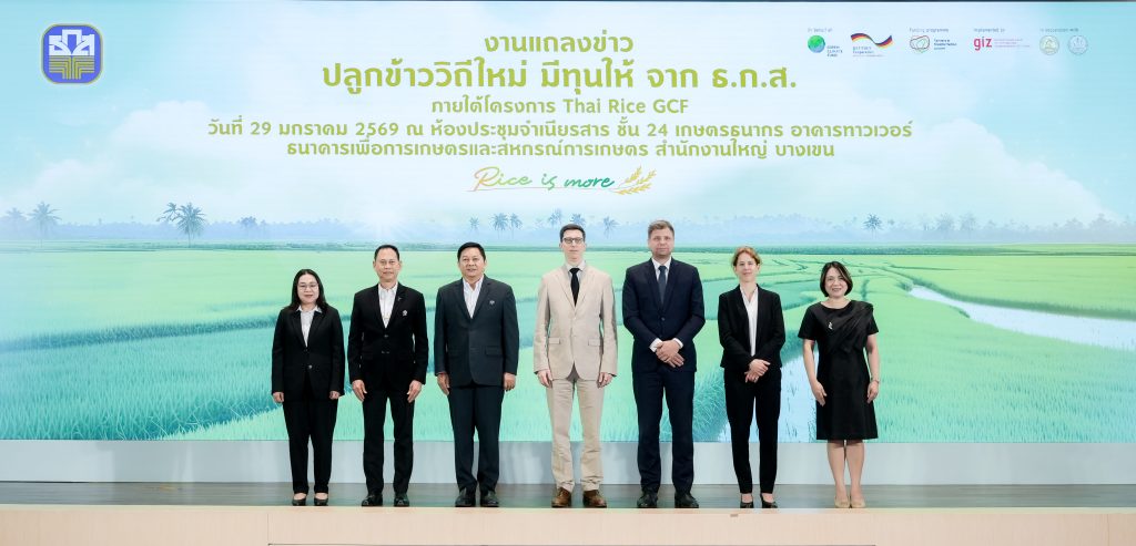 ธ.ก.ส. ร่วม GIZ เปิดตัวเงินอุดหนุนและสินเชื่อดอกเบี้ยต่ำ ภายใต้โครงการ Thai Rice GCF วงเงินกว่า 5,300 ล้านบาท สนับสนุนเกษตรกรผู้ปลูกข้าวไทย 40,000 ราย เพื่อปรับเปลี่ยนวิถีการปลูกข้าวที่เท่าทันต่อสภาพภูมิอากาศ ลดปัญหาโลกร้อน