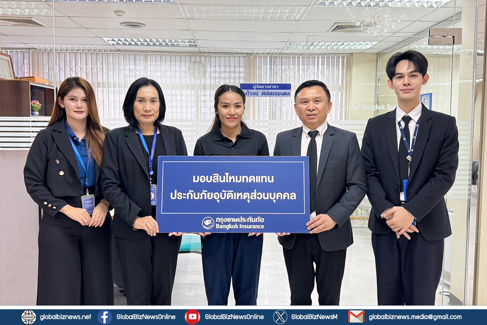 บริษัท กรุงเทพประกันภัย จำกัด (มหาชน) โดยปาริชาต อนุชิตชาตรี (ที่ 2 จากซ้าย) ผู้จัดการสาขาอุดรธานี เป็นผู้แทนบริษัทฯ มอบสินไหมทดแทนประกันภัยอุบัติเหตุส่วนบุคคล PA VIP ให้แก่ สุวรัตน์ จันยอย (กลาง) ซึ่งเป็นภรรยาของผู้เอาประกันภัยและผู้รับประโยชน์ เป็นจำนวนเงิน 3,120,000 บาท จากกรณี เบวิน เลาเรนน์ ไรท์ ผู้เอาประกันภัยเสียชีวิตจากอุบัติเหตุ โดยมีรุ่งโรจน์ พิพัฒนมงคล (ที่ 2 จากขวา) ผู้จัดการธนาคารกรุงเทพ สาขาอุดรธานี ร่วมมอบสินไหมทดแทนและเป็นสักขีพยาน ณ ธนาคารกรุงเทพ สาขาอุดรธานี เมื่อวันที่ 5 พฤศจิกายน 2568