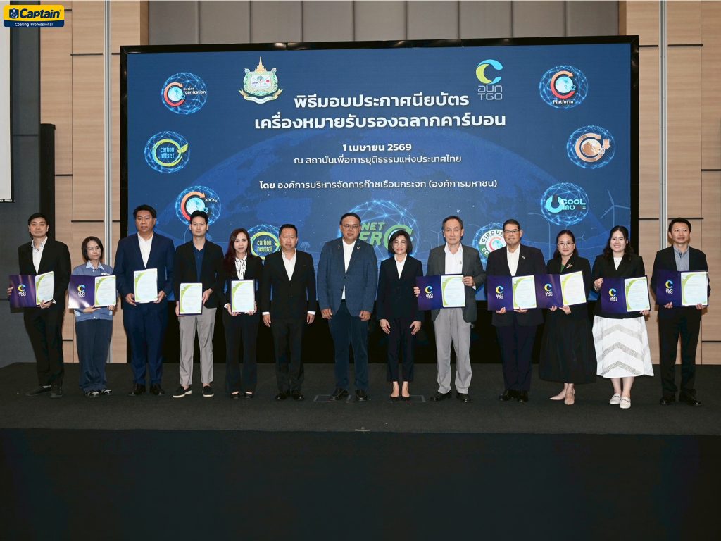 พิธีมอบประกาศนียบัตรจัดขึ้นเมื่อวันที่ 1 เมษายน 2569 ณ Thailand Institute of Justice โดยมี นันทพล บุญเหลือ กรรมการผู้จัดการ บริษัท กัปตัน โค๊ทติ้ง จำกัด เป็นตัวแทนเข้ารับมอบจาก ดร.วิจารย์ สิมาฉายา ประธานกรรมการองค์การบริหารจัดการก๊าซเรือนกระจกท่ามกลางองค์กรชั้นนำที่ร่วมผลักดันมาตรฐานด้านคาร์บอนของประเทศไทย