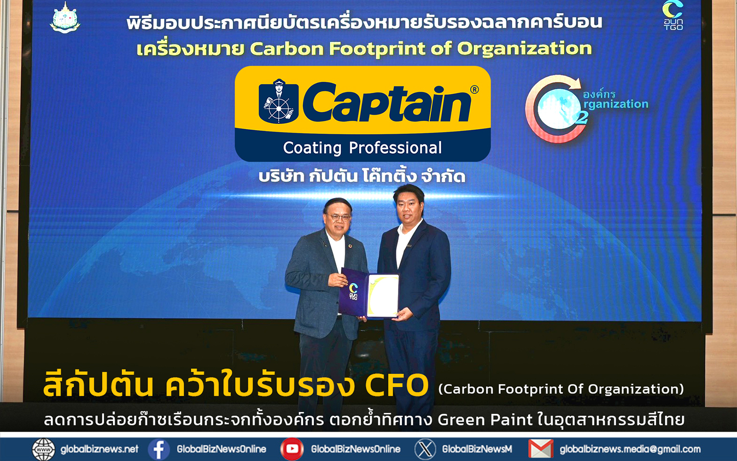 บริษัท กัปตัน โค๊ทติ้ง จำกัด ประกาศความสำเร็จด้านการพัฒนาองค์กรอย่างยั่งยืน หลังคว้าใบรับรอง “คาร์บอนฟุตพริ้นท์ขององค์กร (Carbon Footprint for Organization: CFO)” จาก Thailand Greenhouse Gas Management Organization ซึ่งเป็นมาตรฐานสำคัญในการวัด วิเคราะห์ และบริหารจัดการการปล่อยก๊าซเรือนกระจกอย่างเป็นระบบ สะท้อนการยกระดับการดำเนินธุรกิจสู่แนวทาง ESG อย่างเป็นรูปธรรม และยืนยันถึงความพร้อมขององค์กรในการขับเคลื่อนสู่เป้าหมายด้านสิ่งแวดล้อมในระยะยาว