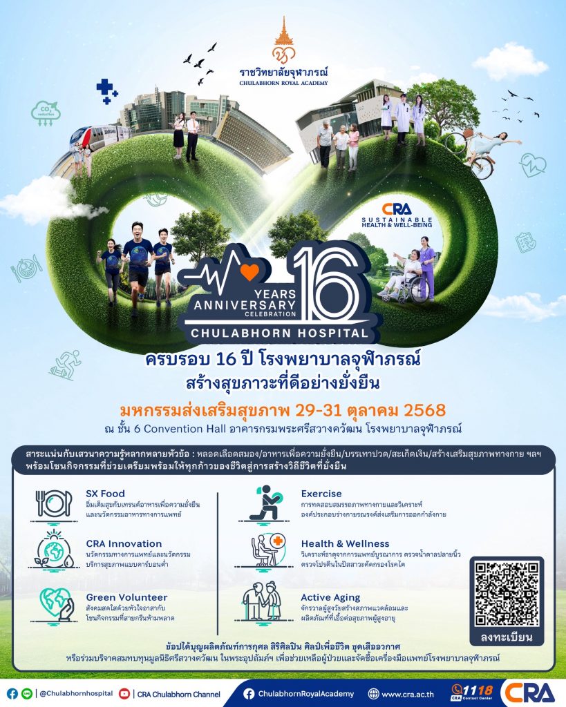 ในวาระครบ 16 ปี โรงพยาบาล จุฬาภรณ์ จัดงาน “มหกรรมส่งเสริมสุขภาพ CRA Sustainable Health & Well-Being” ระหว่างวันที่ 29-31 ตุลาคม 2568 ณ ห้อง Convention Hall ชั้น 6  โซน A อาคารกรมพระศรีสวางควัฒน โรงพยาบาลจุฬาภรณ์ ถนนแจ้งวัฒนะ ซอย 5 หลักสี่ กรุงเทพฯ เพื่อการสร้างสุขภาวะที่ดีอย่างยั่งยืน