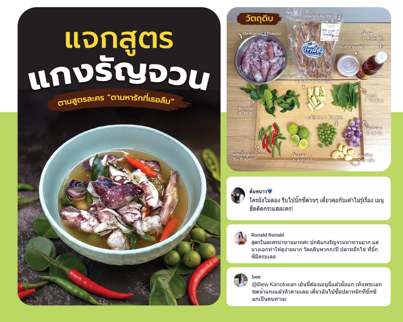 จากเมนูบนหน้าจอ สู่ตะกร้าสินค้าในมือ นี่คือ Key Success ที่ชัดเจนที่สุดของละครเรื่องนี้ที่ใช้ Soft Power ด้านอาหารเป็นตัวเดินเรื่องหลัก โดยเฉพาะเมนูเด็ดอย่าง “แกงรัญจวนปลาหมึก” และวัตถุดิบ “ปลาหมึกแดดเดียวตากแห้งเกาะสีชัง” ที่ถูกถ่ายทอดออกมาได้อย่างน่าทาน จนกลายเป็นกระแสไวรัล สิ่งที่เกิดขึ้นคือพฤติกรรม “ดูแล้วหิว ดูแล้วอยากทำตาม” ผู้ชมไม่ใช่แค่กดไลค์ แต่พุ่งตัวมาที่บิ๊กซีเพื่อตามหาวัตถุดิบเหล่านี้ ส่งผลให้ยอดขายกลุ่มอาหารสด โดยเฉพาะแผนกอาหารทะเล และ เครื่องปรุงรส พุ่งสูงขึ้น 25% ซึ่งเป็นตัวเลขการเติบโตที่สูงมากในภาวะเศรษฐกิจปัจจุบัน พิสูจน์ให้เห็นว่าคอนเทนต์ที่ดี สามารถเปลี่ยนเป็นยอดขายได้ทันที (Immediate Conversion)