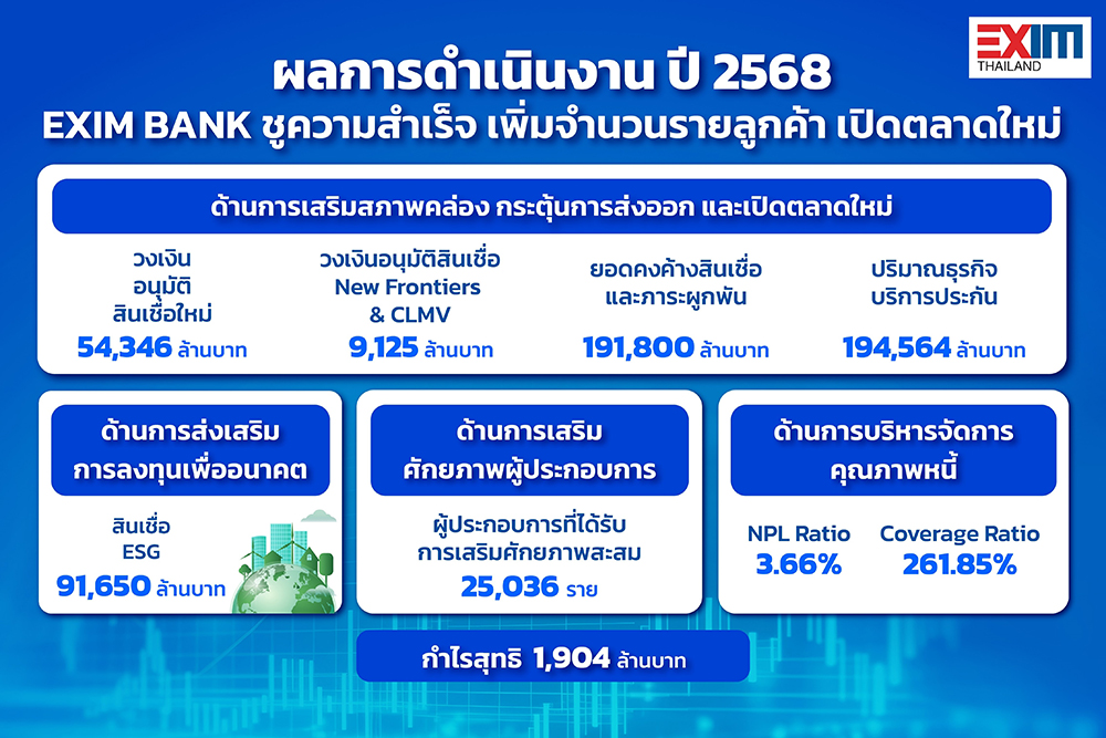 สำหรับผลการดำเนินงานปี 2568 ด้านการเสริมสภาพคล่อง กระตุ้นการส่งออก และเปิดตลาดใหม่ EXIM BANK อนุมัติสินเชื่อใหม่รวม 54,346 ล้านบาท เพื่อเสริมสภาพคล่องและความต่อเนื่องในการดำเนินธุรกิจของผู้ประกอบการไทย ท่ามกลางความผันผวนของเศรษฐกิจโลกและการแข่งขันที่รุนแรง พร้อมผลักดันการกระจายความเสี่ยงด้วยการรุกตลาดใหม่ (New Frontiers) ลดการพึ่งพาตลาดเดิม