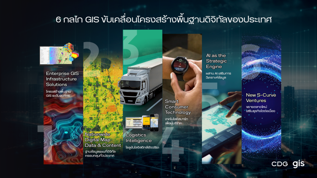 6) GIS Driver 6: New S‑Curve Ventures: ขับเคลื่อนการเติบโตระยะยาวด้วยการต่อยอดความเชี่ยวชาญด้านเทคโนโลยี GIS สู่ตลาดต่างประเทศ พร้อมขยายบทบาทสู่การเป็นพันธมิตรทางเทคโนโลยีในระดับสากล ควบคู่กับการสำรวจและพัฒนาธุรกิจใหม่ที่ต่อยอดจากศักยภาพของ GIS เพื่อสร้างโอกาสทางธุรกิจใหม่และเสริมขีดความสามารถขององค์กรในอนาคต