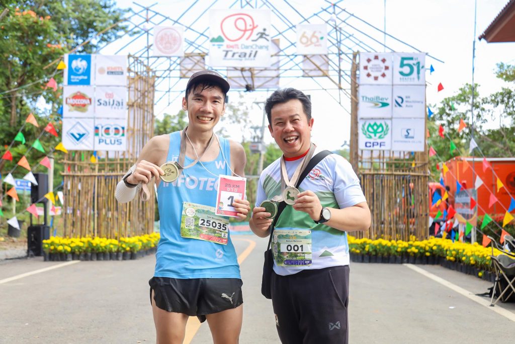 ธนัส วิจิตรสุนทร (คนซ้าย) นักวิ่งอัลตร้ามาราธอนทีมชาติไทยสังกัดทีม Puma Running Thailand เข้าเส้นชัยด้วยเวลา 2.55.52 เป็นอันดับที่ 1 ในระยะทาง 25 กม. และ รศ. ดร.คมสัน มาลีสี (คนขวา) อธิการบดี สจล. เข้าร่วมวิ่งในระยะทาง 10 กม.