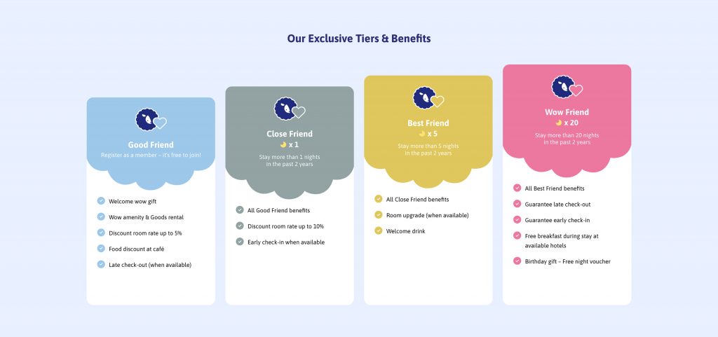 - Wow Friend เป็นระดับสูงสุด มอบสิทธิการันตีเช็กอินก่อนเวลาและเลทเช็กเอาต์ อาหารเช้าฟรีทุกวัน และบัตรกำนัลเข้าพักฟรี 1 คืนเป็นของขวัญวันเกิด