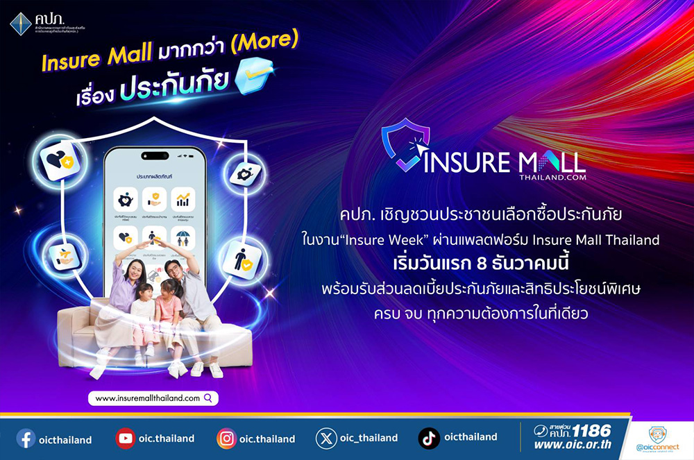 คปภ. เชิญชวนประชาชนเลือกซื้อประกันภัยในงาน “Insure Week” ผ่านแพลตฟอร์ม Insure Mall Thailand เริ่มวันแรก 8 ธันวาคมนี้