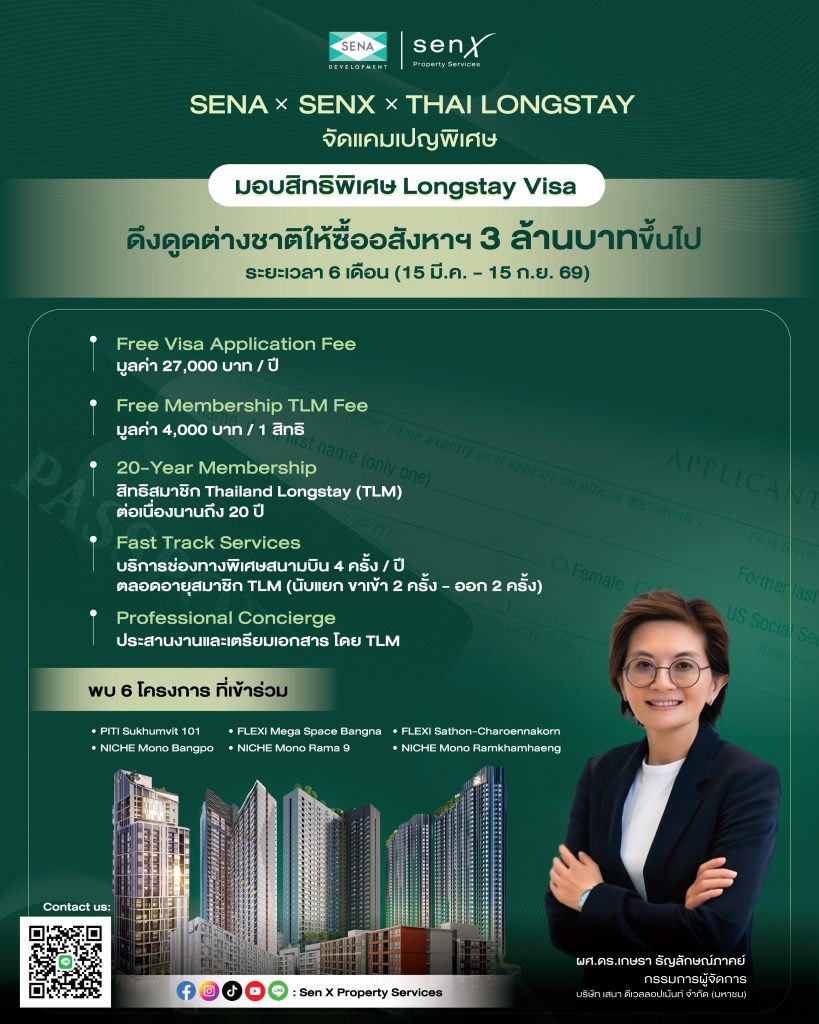โดย บมจ. เซ็น เอกซ์ (SenX) ผู้นำการให้บริการด้านอสังหาริมทรัพย์ครบวงจร ทำหน้าที่เป็นตัวแทนหลักในการขยายช่องทางการขายสู่ตลาดต่างชาติ รวมถึงการสร้างเครือข่ายพันธมิตรที่มีความเชี่ยวชาญในแต่ละด้าน โดยความร่วมมือกับ ไทยจัดการลองสเตย์ (TLM) ซึ่งมีประสบการณ์ในการให้บริการด้านวีซ่าและการพำนักระยะยาวสำหรับชาวต่างชาติ จะช่วยเพิ่มความเชื่อมั่นให้กับนักลงทุนต่างชาติที่สนใจซื้ออสังหาริมทรัพย์ในประเทศไทย และเป็นอีกหนึ่งกลไกในการสนับสนุนเศรษฐกิจไทยผ่านการลงทุนและการใช้จ่ายในประเทศ”