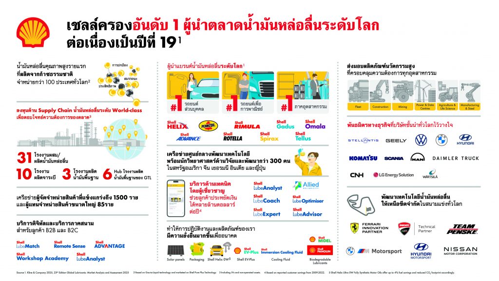 ธุรกิจน้ำมันหล่อลื่นเชลล์ยังครองตำแหน่งแชมป์อันดับ 1 ผู้จำหน่ายน้ำมันหล่อลื่นสำเร็จรูประดับโลกเป็นปีที่ 19 ติดต่อกัน จากรายงานฉบับที่ 23 ของ Kline & Company เรื่อง Global Lubricants: Market Analysis and Assessment 2025
