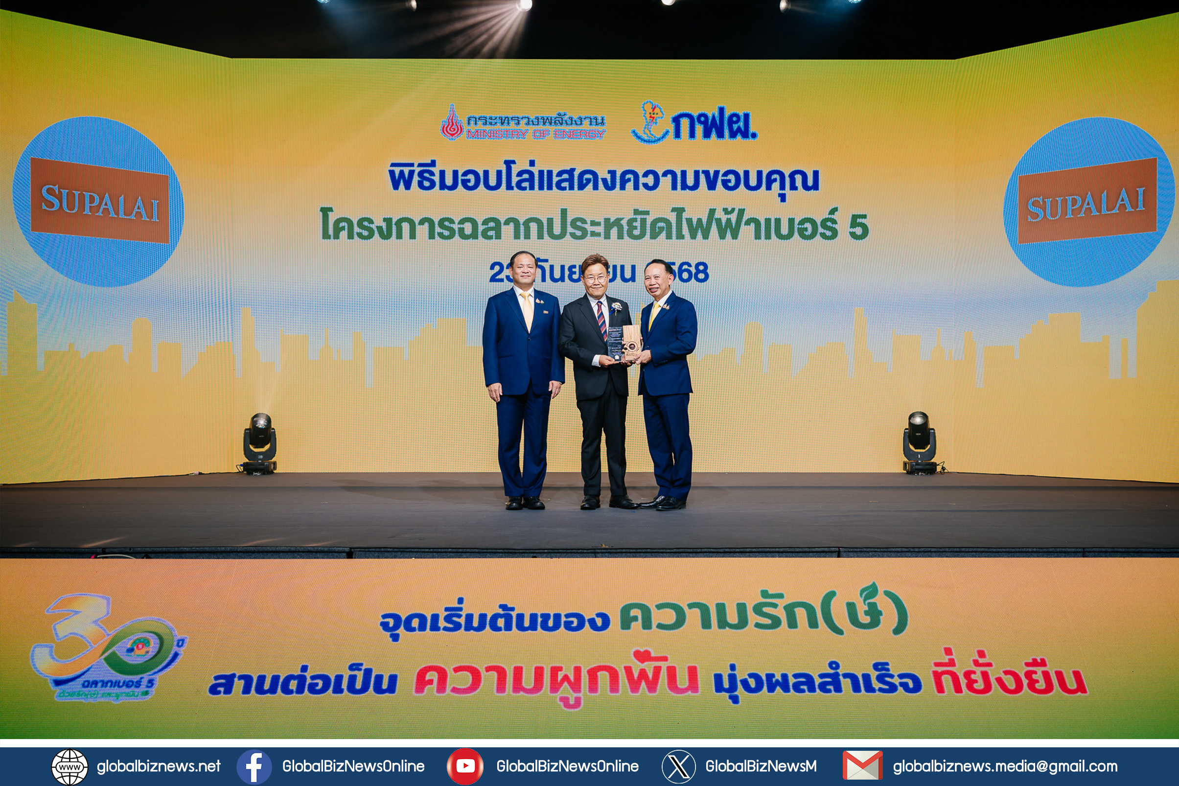 บริษัท ศุภาลัย จำกัด (มหาชน) ร่วมเฉลิมฉลอง “ครบรอบ 30 ปี ฉลากประหยัดพลังงานเบอร์ 5” จัดโดยการไฟฟ้าฝ่ายผลิตแห่งประเทศไทย (กฟผ.) ร่วมกับกรมพัฒนาพลังงานทดแทนและอนุรักษ์พลังงาน (พพ.) พร้อมรับมอบโล่เกียรติคุณในฐานะหนึ่งในหน่วยงานพันธมิตรชั้นนำที่มีบทบาทสำคัญในการสนับสนุนโครงการบ้านประหยัดพลังงานอย่างต่อเนื่อง สอดคล้องกับวิสัยทัศน์ของศุภาลัยในการมุ่งสู่การเป็นผู้นำด้านการพัฒนาอสังหาริมทรัพย์ที่คำนึงถึงคุณภาพชีวิตของผู้อยู่อาศัย ควบคู่กับการสร้างสังคมที่เป็นมิตรต่อสิ่งแวดล้อมและยั่งยืน