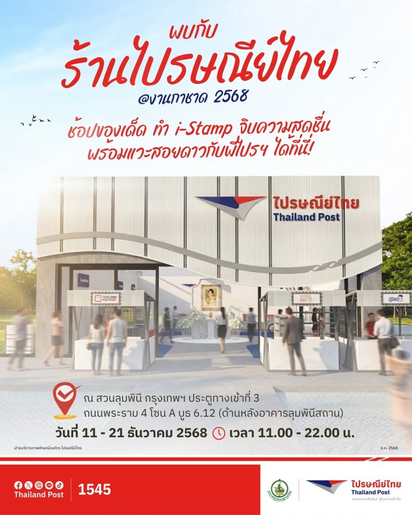 พบกันที่ร้านไปรษณีย์ในงานกาชาด และร่วมกิจกรรมรับโปรโมชันพิเศษมากมาย พร้อมอุดหนุนสลากกาชาดไปรษณีย์ มีสิทธิ์ลุ้นโชครางวัลใหญ่ ยิ่งซื้อมากยิ่งมีสิทธิ์มาก ระหว่างวันที่ 11 – 21 ธันวาคม 2568 ตั้งแต่เวลา 11.00 – 22.00 น. ณ สวนลุมพินี