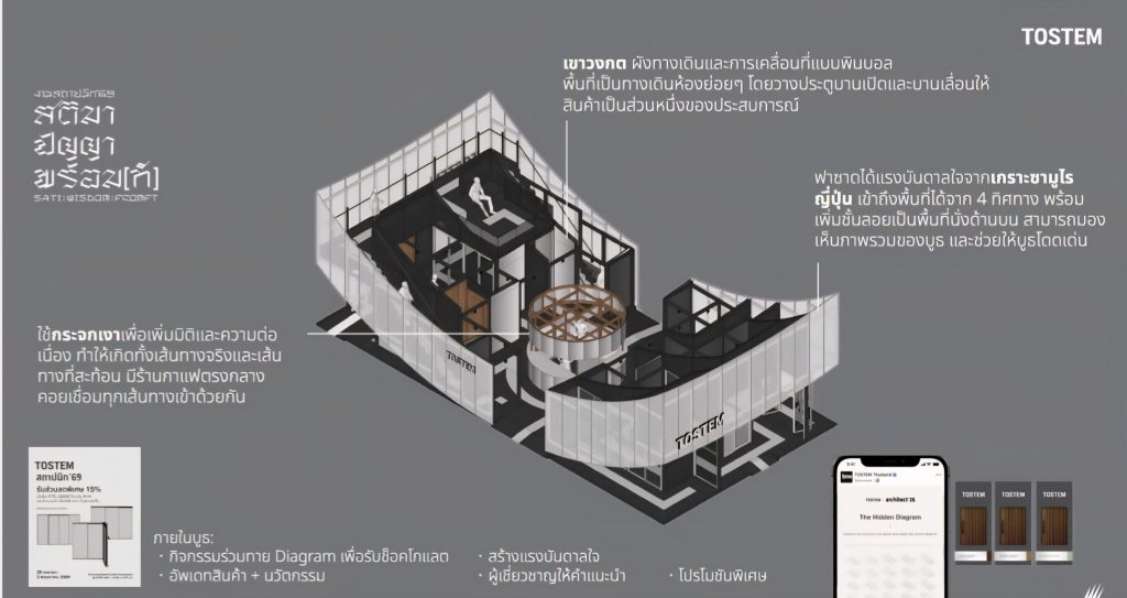 งานสถาปนิก’69 ครั้งนี้ TOSTEM ได้เปิดมิติให้ผู้เข้าชมได้สัมผัสสุนทรียภาพของการจัดสรรสเปซ ผ่านมุมมองของ ภากร มหพันธ์ สถาปนิกจากบริษัท เอ็มสเปซ จำกัด (M SPACE) ที่เริ่มต้นเล่าเรื่องราวตั้งแต่ปราการด่านแรกอย่างฟาซาด โดยหยิบยกความอ่อนช้อยทว่าแข็งแกร่งของเกราะซามูไรญี่ปุ่นมาตีความใหม่เป็นเส้นสายโค้งมนที่ดูมีชีวิต ตัวโครงสร้างถูกออกแบบให้ลอยเด่นและเปิดกว้างทั้ง 4 ทิศทาง เชิญชวนให้ทุกคนก้าวเข้าสู่โลกของ TOSTEM พร้อมยกระดับประสบการณ์ด้วยชั้นลอย มองเห็นภาพรวมของพื้นที่จัดแสดงทั้งหมดได้จากด้านบน และโดดเด่นสะดุดตาจากระยะไกล