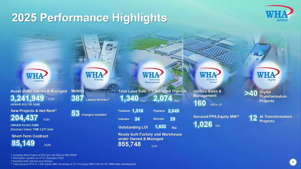 พร้อมเผยทิศทางธุรกิจปี 2569 ภายใต้พันธกิจ  “WHA: SHAPE THE FUTURE FOR THAILAND” เพื่อตอกย้ำบทบาทผู้บุกเบิกเศรษฐกิจใหม่พร้อมสร้างโอกาสการเติบโตให้กับประเทศไทย (New Economy, Unlocking the New Opportunities) เพื่อตอบรับเมกะเทรนด์โลกและเสริมความแข็งแกร่งให้กับ 5 กลุ่มธุรกิจหลัก
