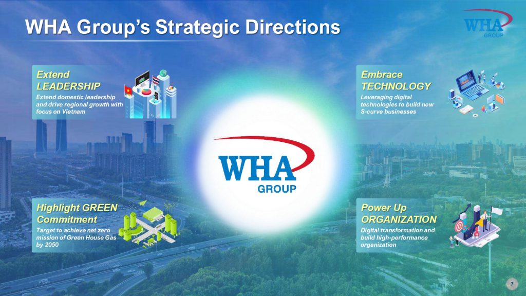 ภายใต้พันธกิจ “WHA: SHAPE THE FUTURE FOR THAILAND” บริษัทมุ่งขับเคลื่อนประเทศไทยสู่ยุคเศรษฐกิจใหม่ ผ่านการลงทุนในโครงสร้างพื้นฐานและนวัตกรรมดิจิทัลที่ยั่งยืน เสริมศักยภาพการแข่งขันของประเทศ และสร้างระบบนิเวศรองรับอุตสาหกรรมแห่งอนาคตอย่างมั่นคงในระยะยาว