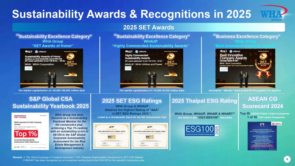 ความมุ่งมั่นดังกล่าวสะท้อนผ่านความสำเร็จในปี 2568 โดยบริษัทได้รับรางวัลระดับประเทศและระดับโลก อาทิ รางวัลพระราชทานสมเด็จพระกนิษฐาธิราชเจ้า กรมสมเด็จพระเทพรัตนราชสุดาฯ สาขา Leadership Excellence จาก TMA คะแนนสูงสุดติดอันดับ Top 1% จาก S&P Global CSA รางวัล Best Innovative Company และ SET Awards of Honor ในกลุ่มรางวัล Sustainability Excellence จาก SET Awards 2025